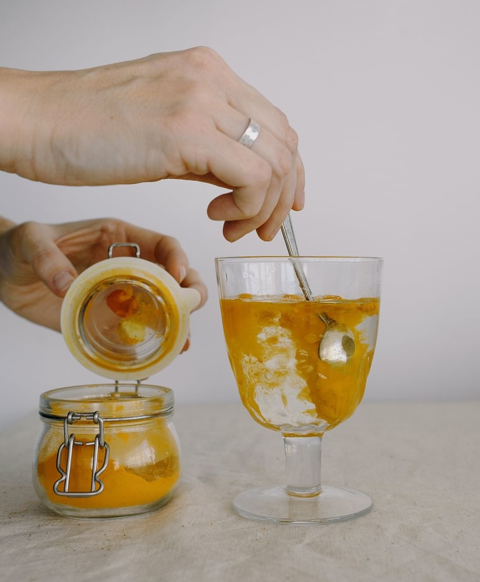 아침에 미지근한 물과 섞인 생 강황 주스 1 티스푼을, 밤에는 강황 가루를 뜨거운 물에 섞어 마시면 된다.
