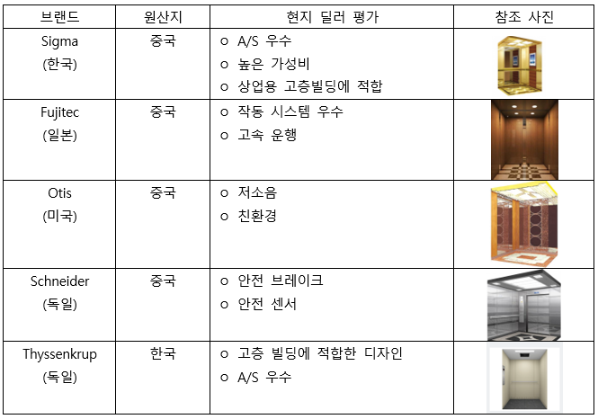 방글라데시 엘리베이터 시장 주요 브랜드별 원산지 및 현지 딜러 평가