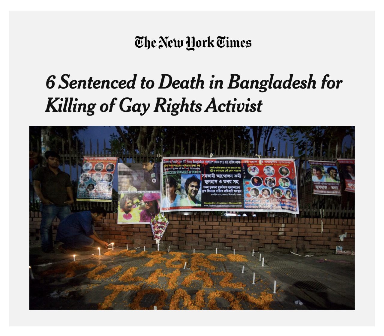 6명의 조직원은 줄하즈 만난, 마흐부브 라비 토노이 등 2명의 인권활동가를 살해한 혐의로 최근까지 재판을 받아왔습니다. 숨진 만난은 당시 방글라데시의 유일한 성 소수자 잡지 ‘루프반’의 편집자였고, 토노이는 해당 잡지 집행위원이자 배우였습니다.