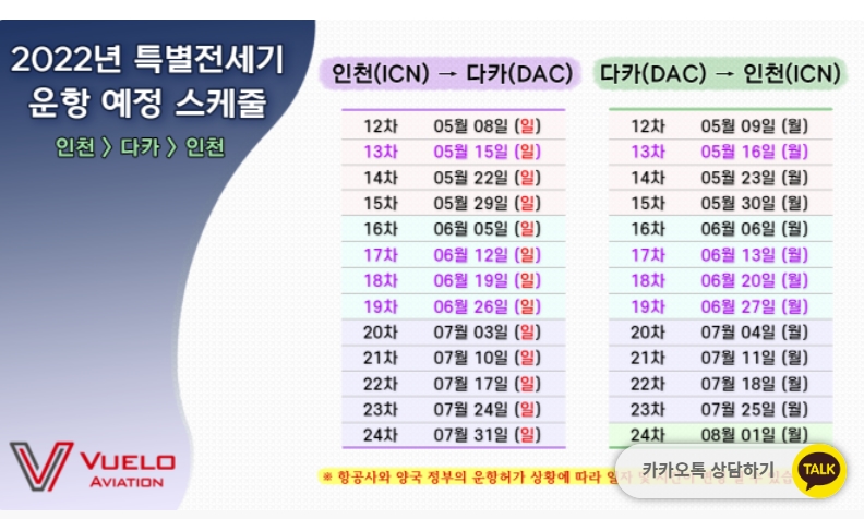 전세기 운항 전문업체인 브엘로항공은 현재 유일한 인천-다카 직항편을 운항 중이다.