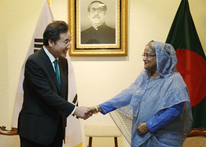 방글라데시를 공식 방문한 이낙연 국무총리는 14일(현지시간) 셰이크 하시나 방글라데시 총리와 회담 하고 양국 투자ㆍ개발 등에서의 협력 확대 방안을 논의했다. 한국 국무총리가 방글라데시를 방문한 것은 17년 만이다. 이 총리는 하시나 총리의 국내 방글라데시 근로자 고용확대 요청에 “종합적으로 검토해보겠다”고 답했다.